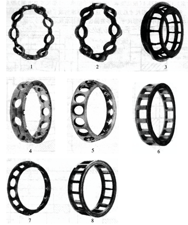 1. Wave shaped retaining frame; 2. Riveted cage for deep groove ball bearings; 3. Retainers for self-aligning roller bearings;